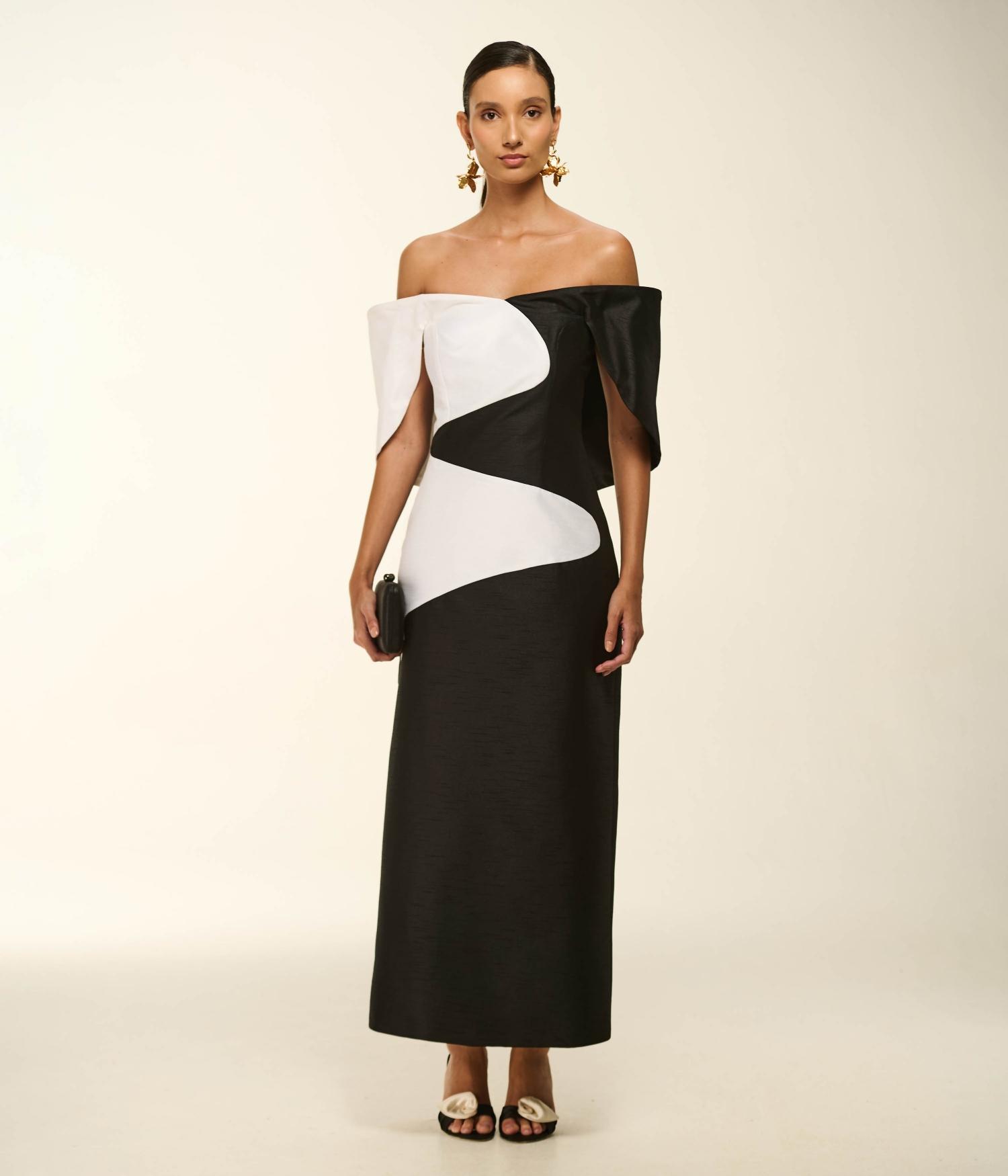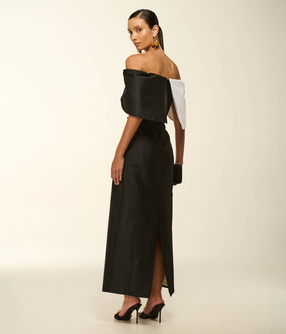 Vestido Midi em Shantung Bicolor com Ombro a Ombro Estruturado