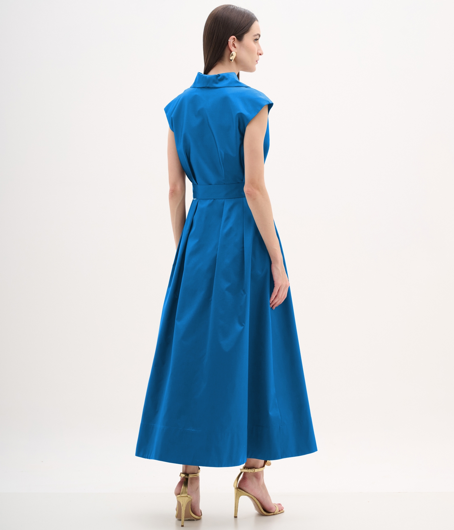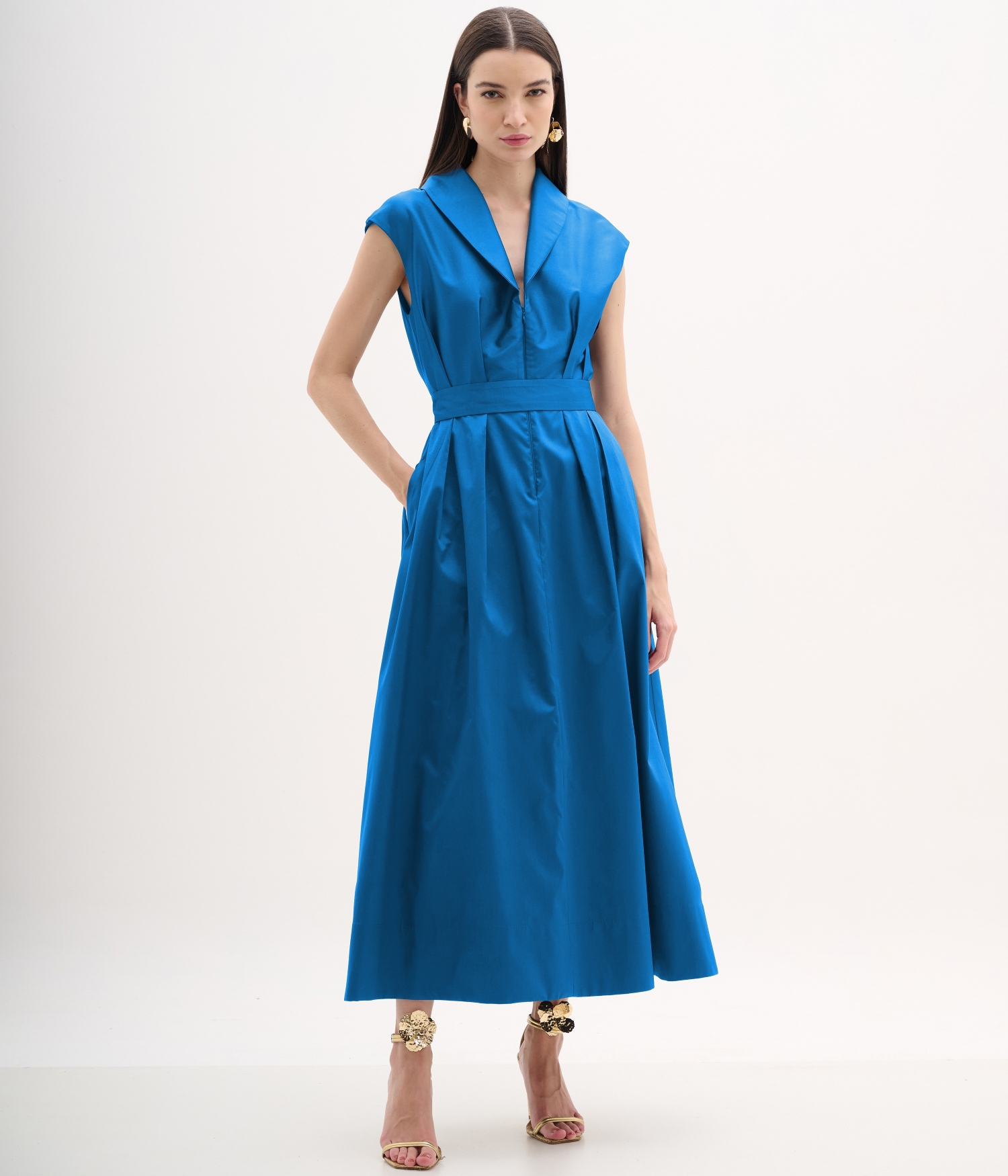 O vestido midi em tafetá azul traduz elegância atemporal com uma proposta sofisticada e feminina. Com design inspirado na alfaiataria, a peça apresenta decote em V com lapela estruturada, que valoriza o colo de forma sutil e refinada.