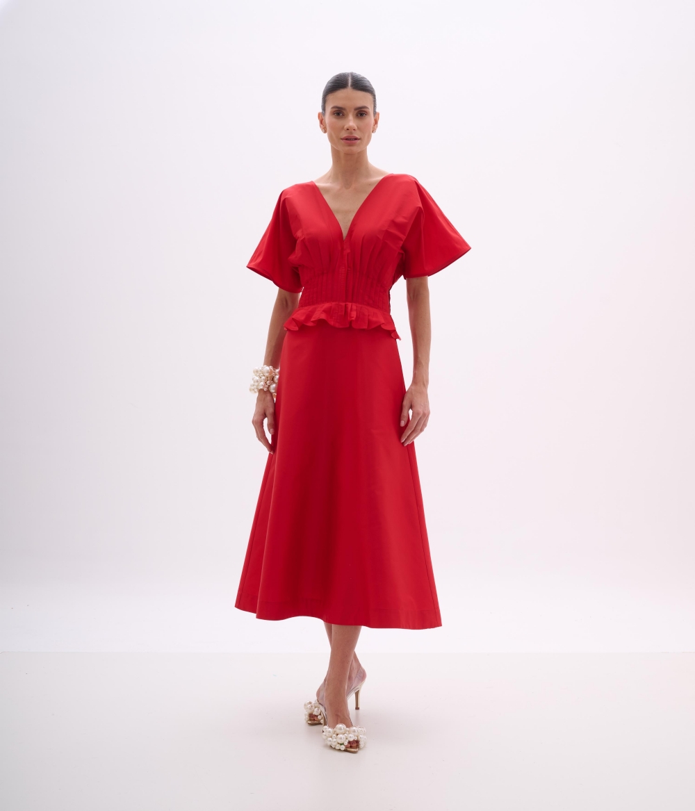 As mangas amplas, de shape triangular, adicionam movimento arquitetônico e equilibram a silhueta com leve dramaticidade. Na cintura, o trabalho de pregas e pespontos cria efeito estruturado que afina e valoriza a região, finalizado por um delicado babado peplum, trazendo charme e feminilidade ao design.