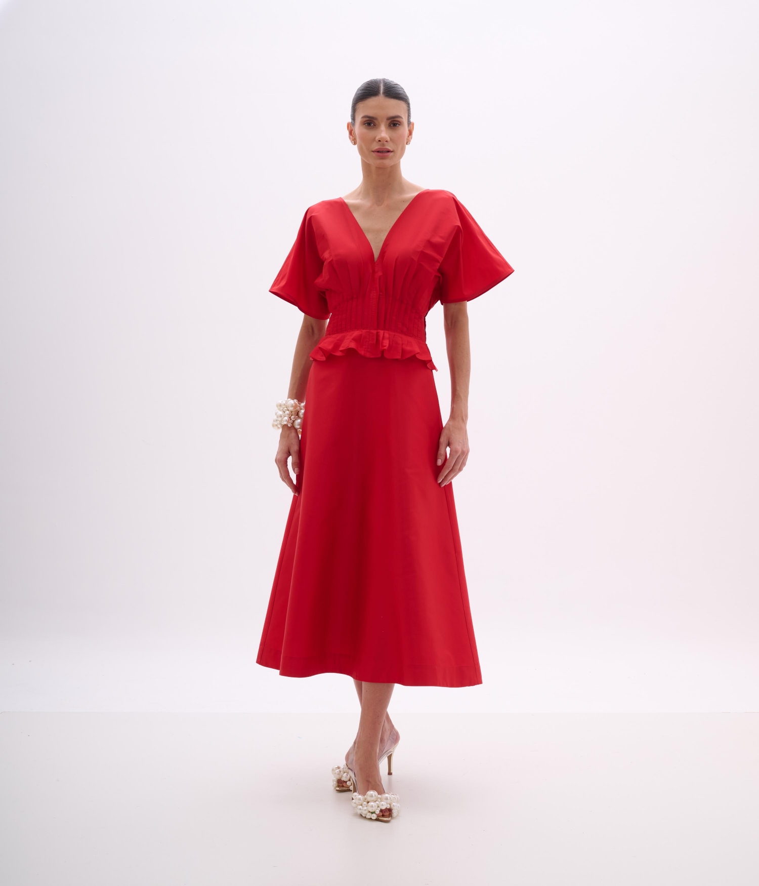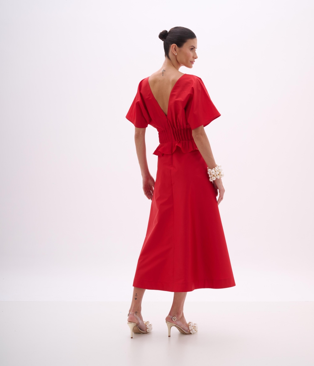 Vestido elegante confeccionado em tafetá estruturado, tecido de brilho sutil e toque levemente armado, que proporciona um caimento sofisticado e com presença. O modelo apresenta decote V profundo na frente e nas costas, valorizando o colo e conferindo modernidade ao visual.