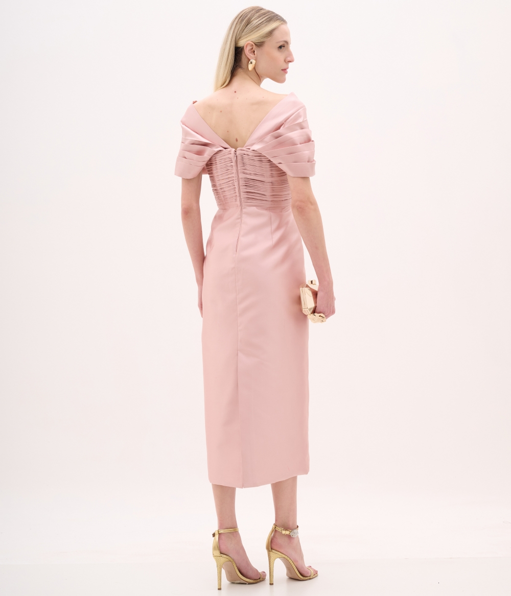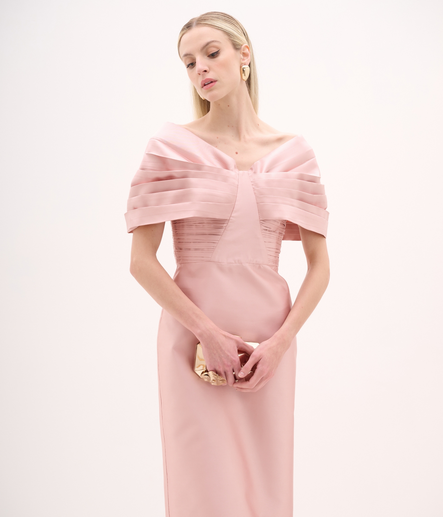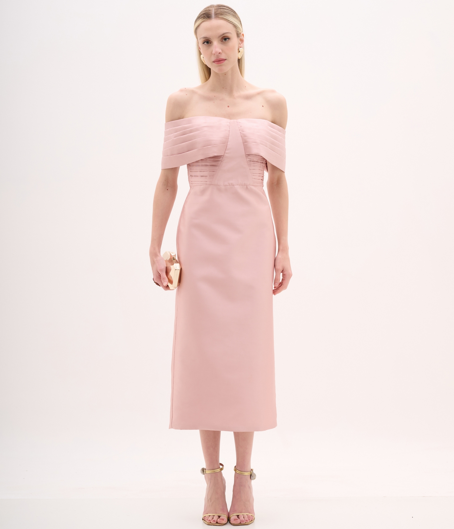 O Vestido Midi em Zibeline Rosa Blush é uma obra de alfaiataria que impressiona pela modelagem escultural. Confeccionado em zibeline, tecido de estrutura firme e brilho acetinado, o vestido possui um corpo estruturado com recortes estratégicos que desenham o busto e marcam a cintura com precisão. A saia, com pregas fêmeas profundas, abre-se em um volume "princesa" moderno, garantindo um movimento majestoso e imponente. A cor Rosa Blush suaviza a arquitetura da peça, trazendo um equilíbrio perfeito entre força e delicadeza. É um modelo pensado para vestir com perfeição, valorizando a postura e a silhueta feminina.
