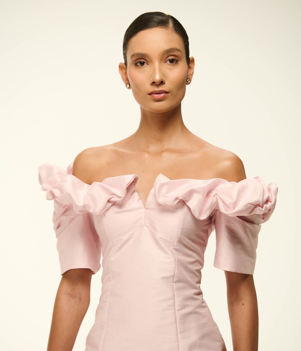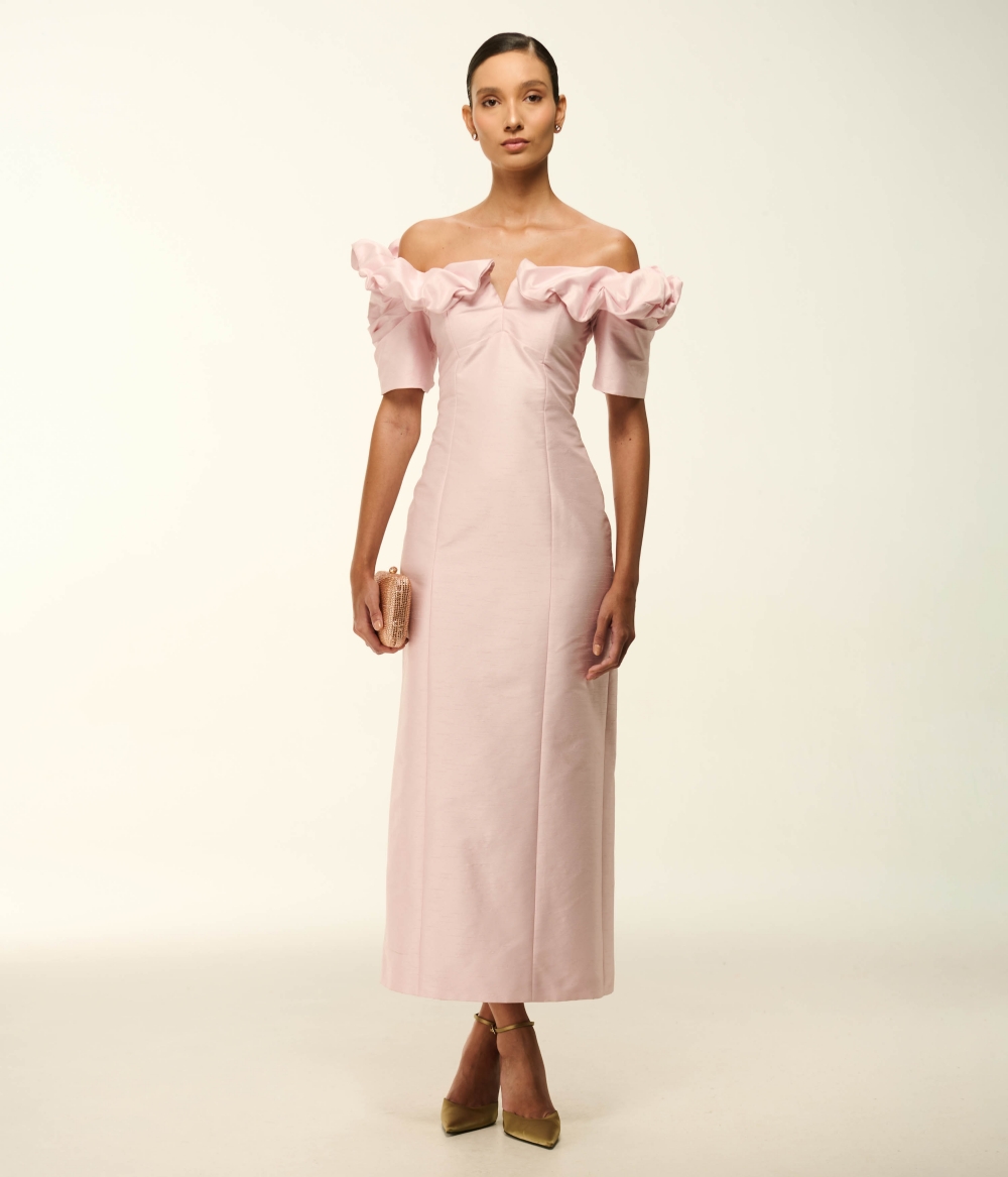 O vestido reinventa o romantismo estruturado com modelagem off-the-shoulder estratégica, babados volumosos no decote e mangas curtas bufantes que criam silhueta exagerada e poética, enquanto corpete justo em V sutil abraça o busto com precisão alta costura. Tecido shantung sustenta volume sem deformações, com painéis verticais na saia reta longa ao chão garantindo caimento reto e alongado, capturando luz em brilho acetinado sutil para presença nobre. Ideal para convidadas que buscam opulência minimalista em galas, com equilíbrio perfeito entre drama romântico e clean luxury contemporâneo.