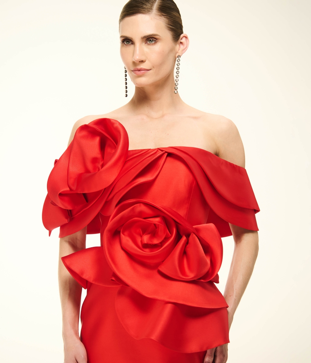 O zibeline é a essência arquitetônica desta obra, com textura firme e encorpada que sustenta babados off-shoulder e apliques 3D sem deformações, mantendo forma por horas. Seu brilho acetinado sutil amplifica o vermelho fogo, refletindo luz de forma nobre e controlada, enquanto a fluidez na saia garante drape orgânico resistente a amassados: a combinação perfeita para produções de impacto duradouro e sofisticação impecável.