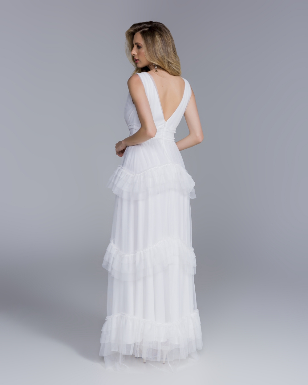 Confeccionado em tule leve e fluido, o vestido apresenta transparência suave e toque delicado, proporcionando um visual etéreo e sofisticado. O tecido não possui elastano, por isso recomendamos a consulta à tabela de medidas para a escolha do tamanho ideal.