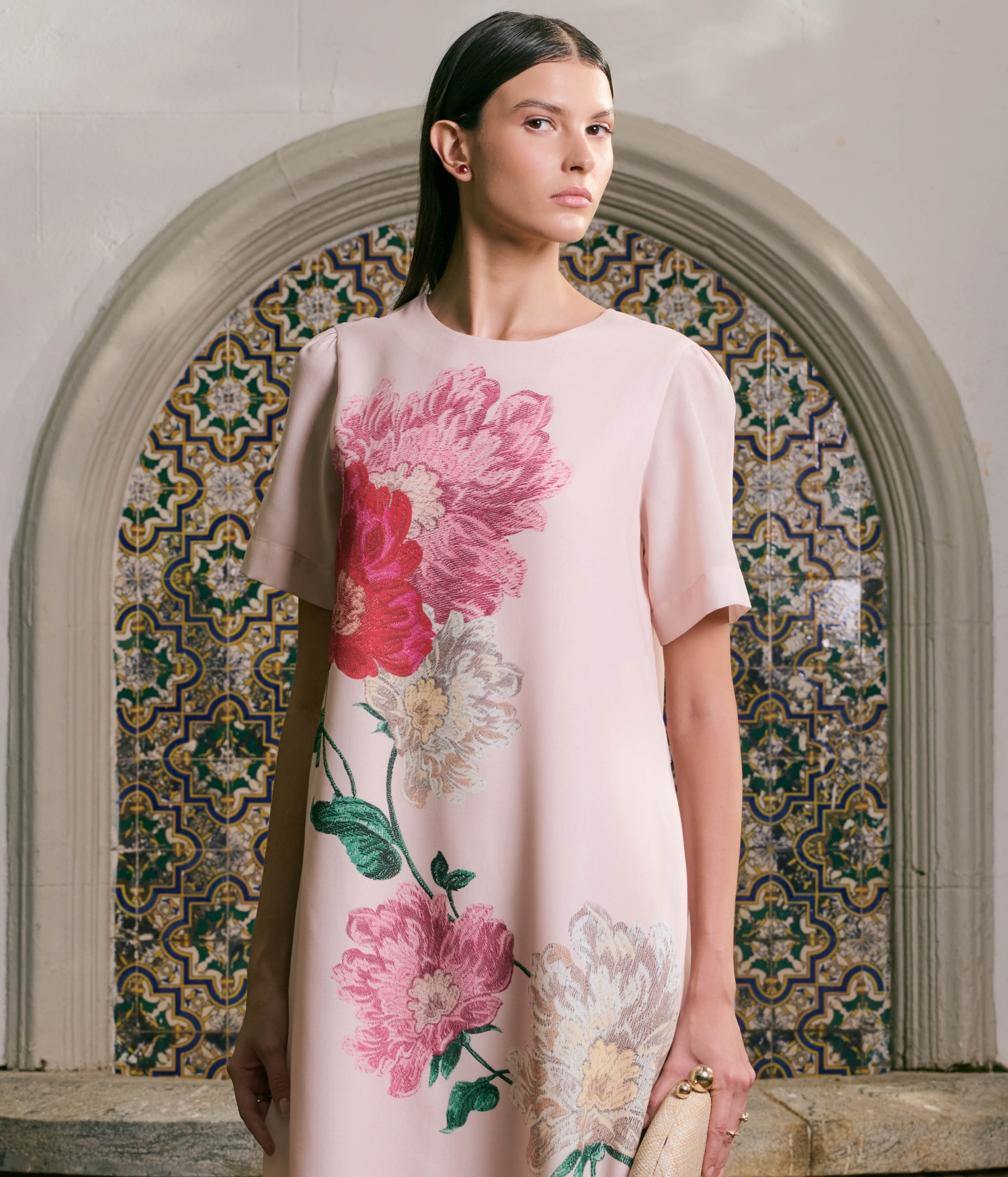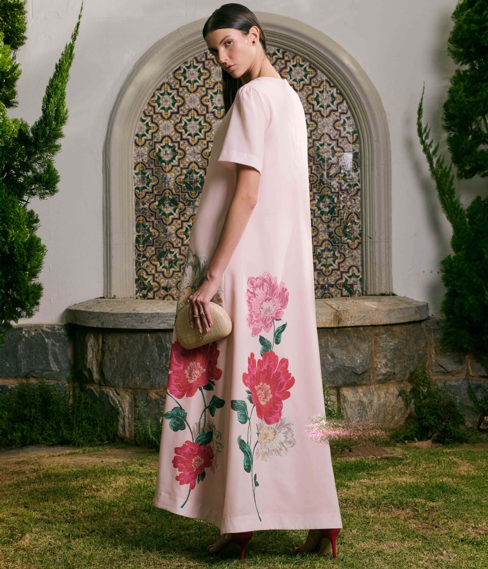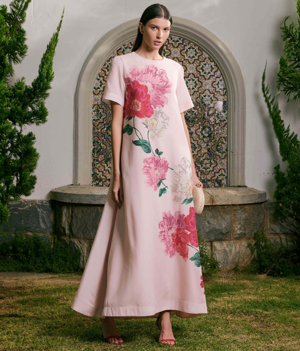 O vestido confeccionado em medoc apresenta modelagem ampla proporcionando um visual moderno e comfy. Possui manga curta, decote aredondado acabamento pespontado.