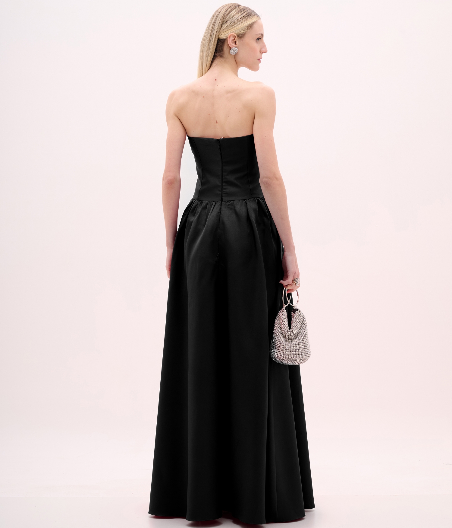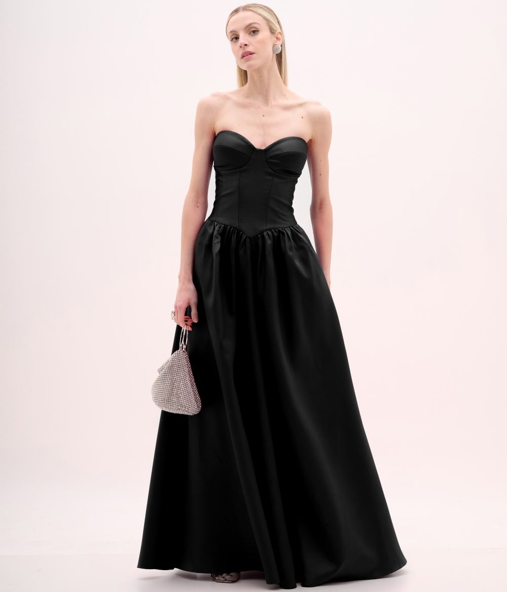 Modelo: Longo, tomara que caia, corpo estruturado com saia ampla